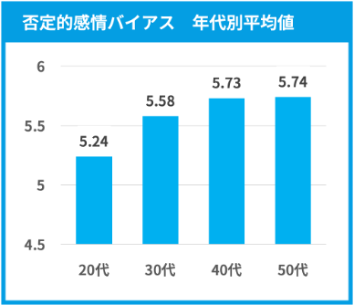 物事に対するネガティブな感情の抱きやすさを表す「否定的感情バイアス」は、年代が上がるほど高くなり、50代の平均点は20代よりも0.50点高い結果になりました。