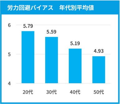 労力に対する感度「労力回避バイアス」は、年代が上がるほど弱くなり、20代の平均点は50代よりも0.86点高いという結果になりました。