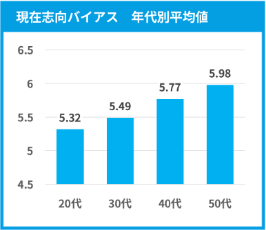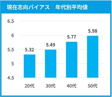 先々の価値より目にみえる現在の価値を高く評価する度合い「現在志向バイアス」は、年代が上がるほど高くなり、50代の平均点は20代よりも0.66点高い結果になりました。