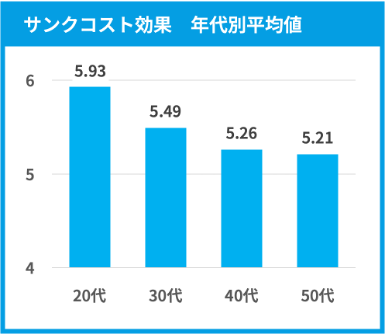 過去に投資したリソースの影響の受けやすさを表す「サンクコスト効果」は、年代が上がるほど弱くなり、20代の平均点は50代よりも0.72点高い結果になりました。
