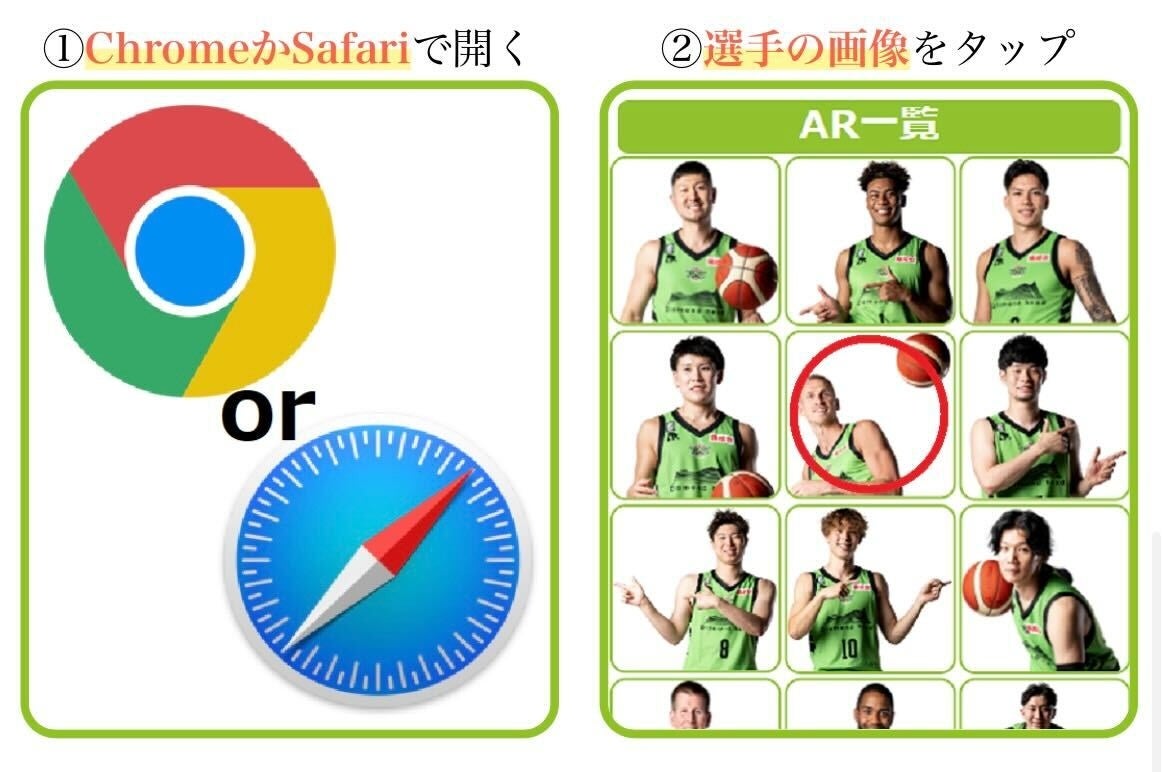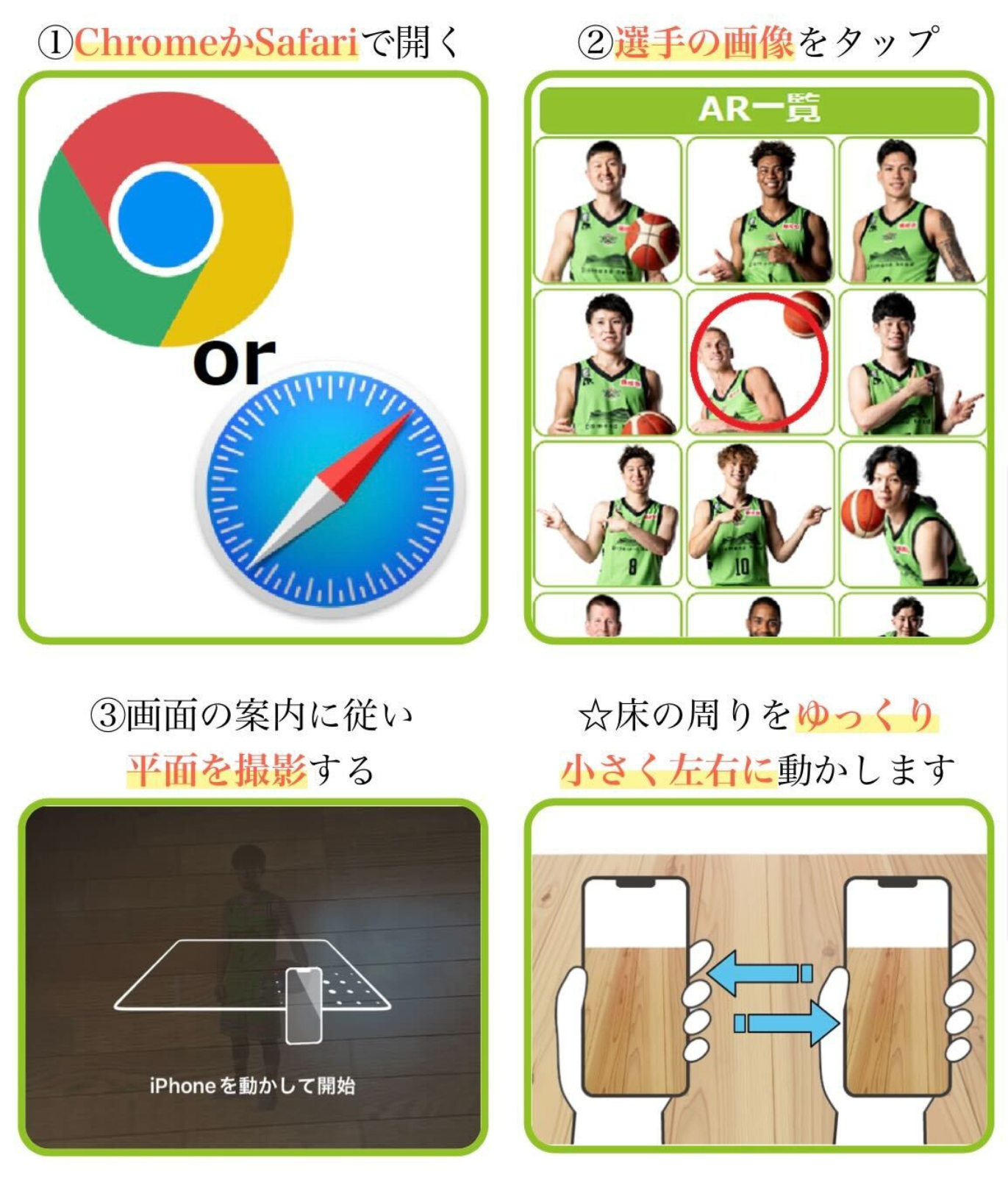 ホームゲームが開催される日に、上記URLをスマートフォンやタブレット端末で読み込み「試合日専用AR」をタップすることで撮影いただけます。ランダムで選手やコーチが2名表示され、対戦相手と試合日も共に撮影いただくことが可能なデザインとなっておりますので、試合を見に行った記念にぜひ撮影いただければと思います。