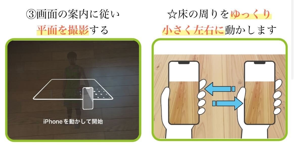 ③画面に表示される案内に従い、床などの平面を撮影しスマートフォンをゆっくり、小さく左右に動かします。