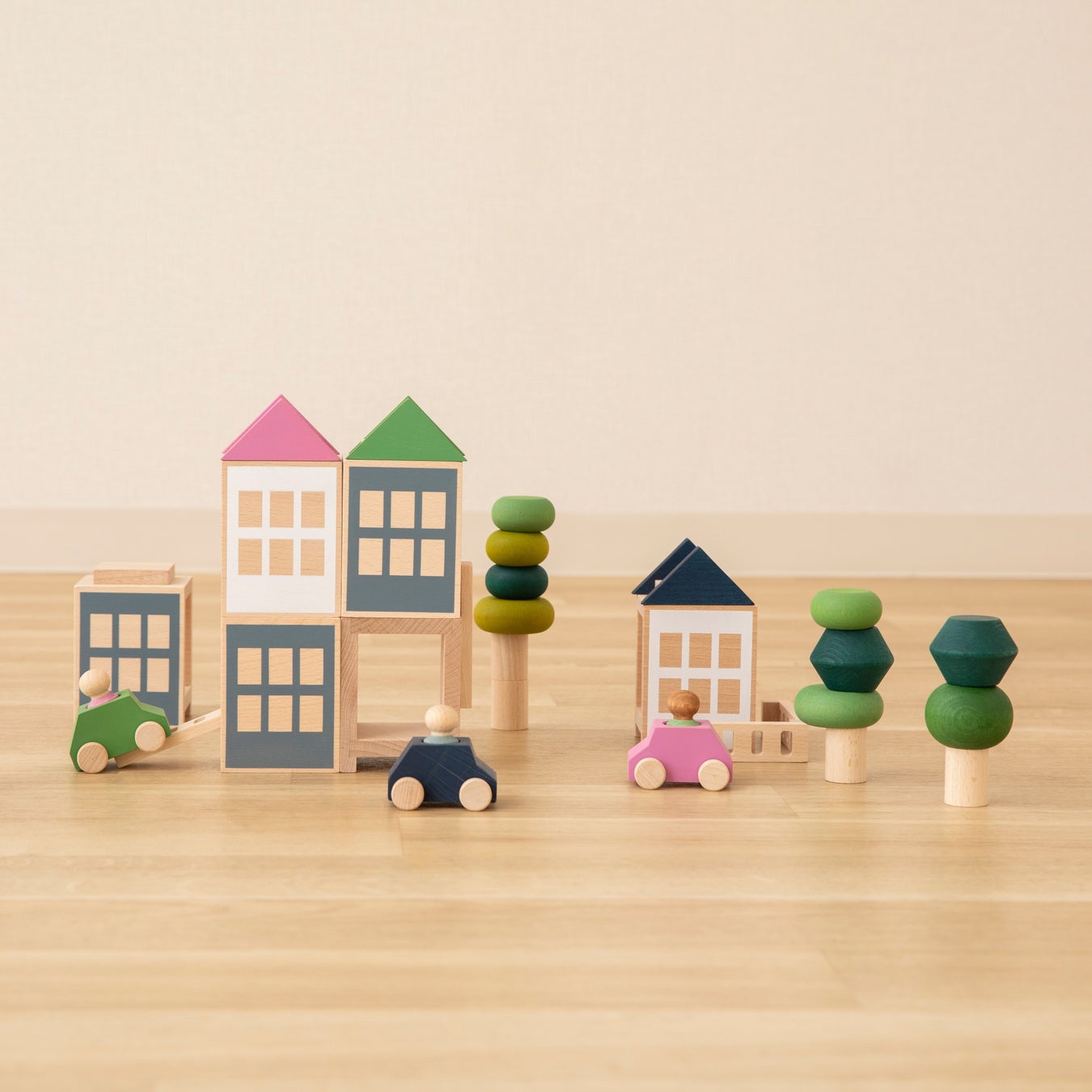 ミニマルなデザインの積み木は、遊びながら子どもたちのアイディアを次々とふくらませてくれます。
