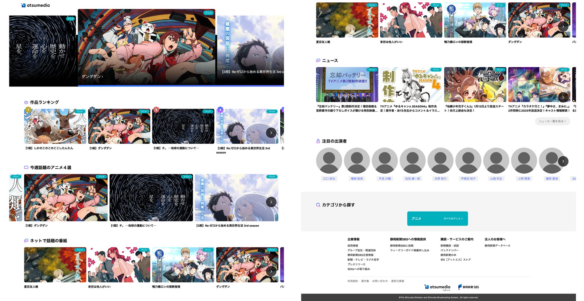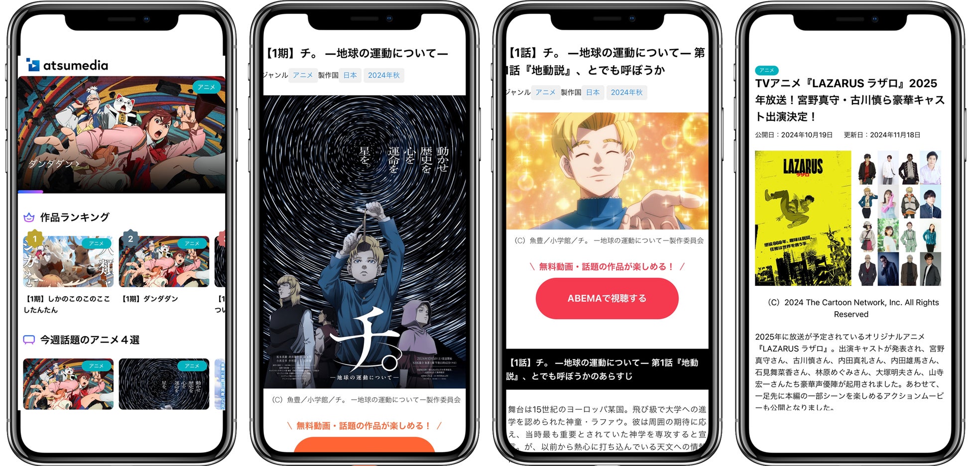 『atsumedia(あつめでぃあ)』では、各作品のあらすじや出演者情報をはじめ、さまざまなエンタメ情報を簡単にチェックすることができます。気になる作品を見つけたら、各配信サービスへのリンクを通じてすぐに視聴を楽しむことができます。アニメカテゴリを中心にスタートしますが、今後はドラマ、映画、バラエティ、スポーツなど、幅広いジャンルをカバーし、コンテンツの充実を図ってまいりますので、ご期待下さい。