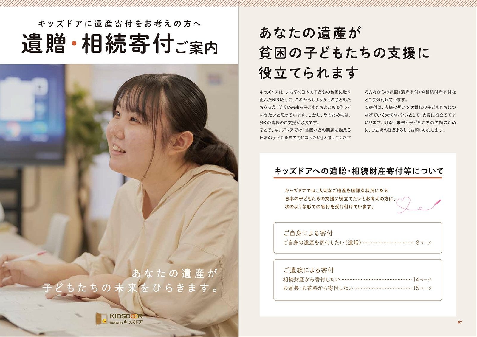 キッズドアでは遺贈・相続財産寄付の方法や流れをご案内するパンフレットをご用意しています。