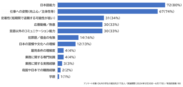 OURは、アジア4ヵ国(フィリピン・ミャンマー・インドネシア・ラオス)で自社の学校を運営し、教育(日本語・専門知識)・寮・食事など、教育に係わる全てを無償で学生に提供しています。これにより、家庭の経済状況を問わず、意欲及び能力のある質の高い学生を広く募集し育成できると共に、学生から費用を徴収していないからこそ、例えば、学習態度が良くない学生は退校させる等のスクリーニングが可能なため、意欲が高く、定着性の高い人材の紹介を可能にしています。また、OURが実施した「外国人採用において重要だと思う事項」についてのアンケート結果(対象:OURの学生の就労先317法人、期間:2024年5月末~6月中旬)では、「日本語能力」「仕事への姿勢」が約80%と上位にあげられていることから、雇用側のニーズとOURの学生の特長が一致していることがわかります。