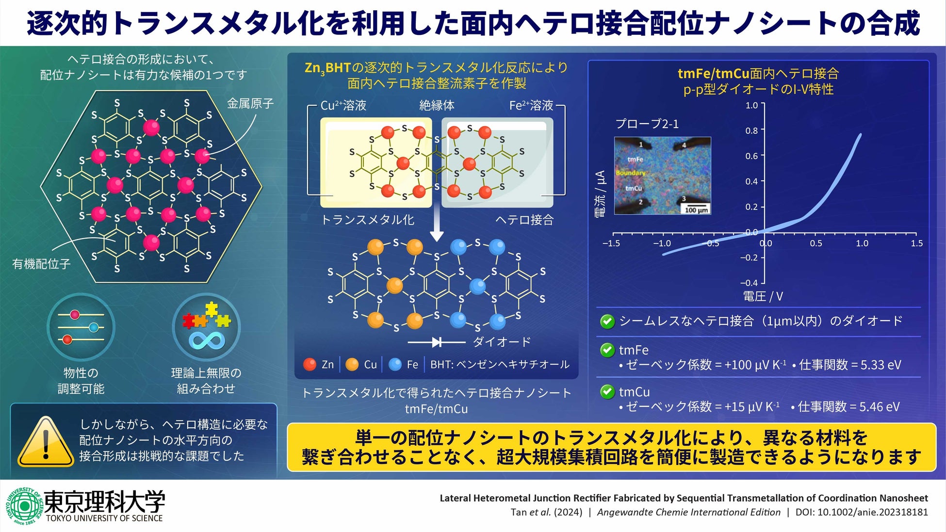 東京理科大学 研究推進機構 総合研究院のTan Choon Meng博士(研究当時)、福居 直哉助教、髙田 健司助教、前田 啓明助教、西原 寛教授らの研究グループは、Znを中心金属とするメタラジチオレン配位ナノシート(Zn3BHT)において、シートの下半分をCu2+溶液、上半分をFe2+溶液に浸漬してトランスメタル化反応を進行させることにより、温和な条件で簡便に面内ヘテロ接合(tmFe/tmCu)を作製することに成功しました。また、作製したtmFe/tmCuは整流作用を示すことを明らかにしました。本研究成果をさらに発展させることにより、新たなエレクトロニクス・光学デバイス開発への貢献が期待されます。