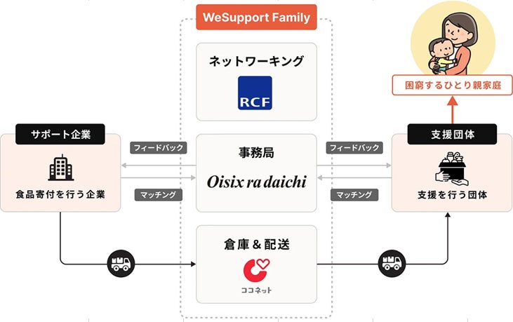 「WeSupport Family」は、困窮するひとり親家庭を支援するプラットフォームです。サポート企業から提供いただいた食材や物資を、ニーズとマッチングした上で、支援団体を介して毎月ご家庭にお届けしています。サポート企業には下記のようなメリットがあり、83社(2025年6月末時点)が賛同しています。