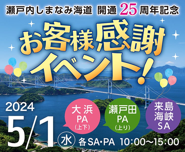 今年5月1日に、E76西瀬戸自動車道(瀬戸内しまなみ海道)が開通25周年を迎えます。これを記念し、瀬戸内しまなみ海道をご利用のお客様に日頃の感謝の気持ちを込めて「お客様感謝イベント」を開催します。