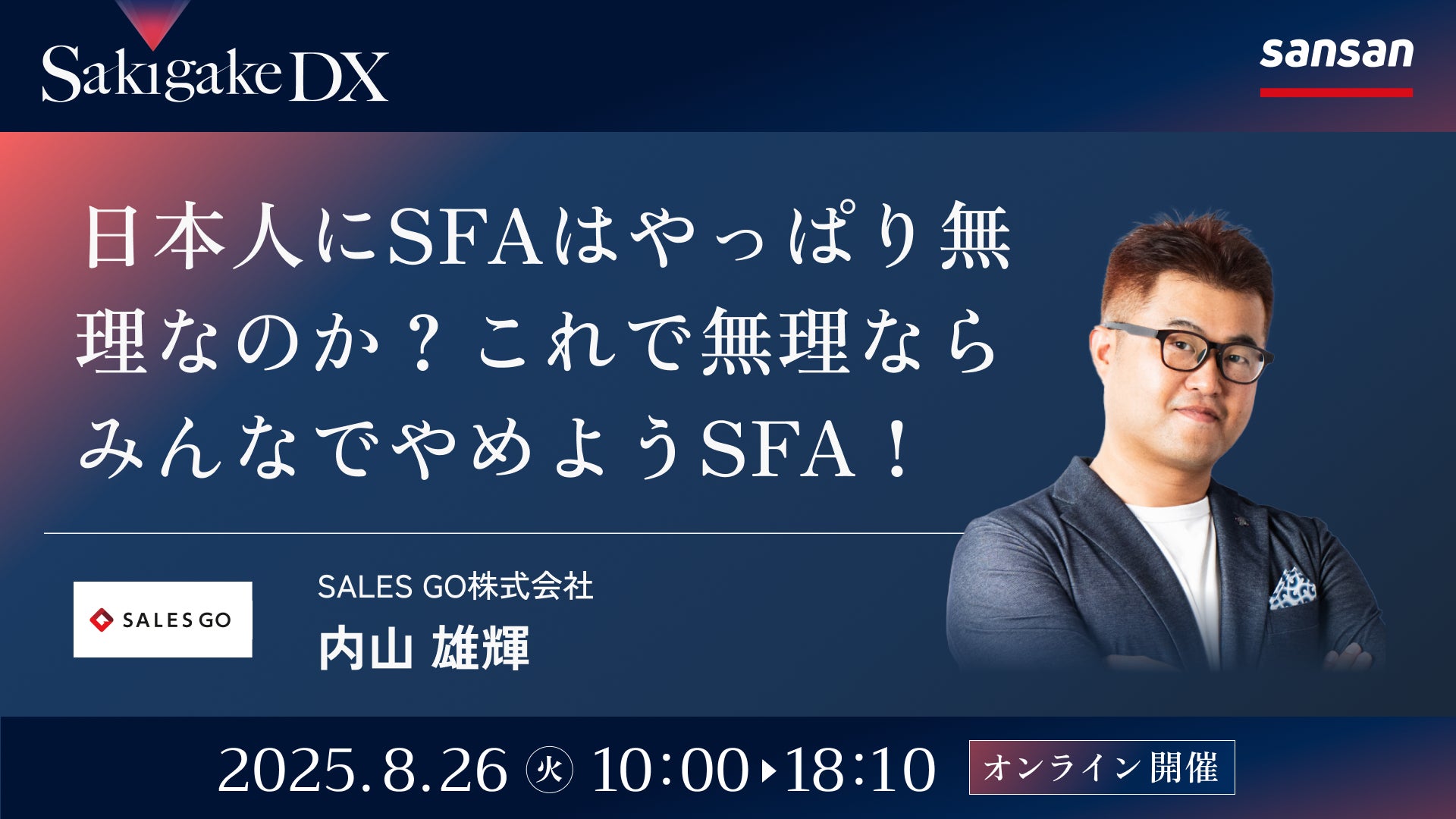 「データのチカラをすべての企業へ」をミッションに掲げるSALES GO株式会社(所在地:東京都中央区、代表取締役社長:内山 雄輝、以下SALES GO)は、2025年8月26日(火)にオンラインで開催されるSansan株式会社主催のセミナー「Sakigake DX ~SFA・CRM・MA活用の現在地~」に、代表取締役社長の内山 雄輝が登壇することをお知らせします。
