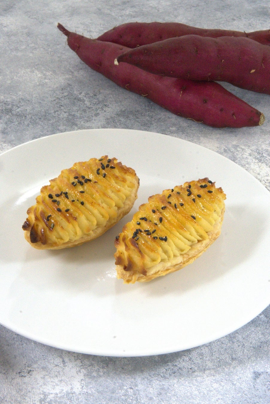 きめ細かな粉質と上品な甘さが特徴の五郎島金時をたっぷりと使い、上質なバターや生クリームと一緒にスイートポテトの餡に仕立て、サックサクのパイ生地にたっぷりと絞り出しました。