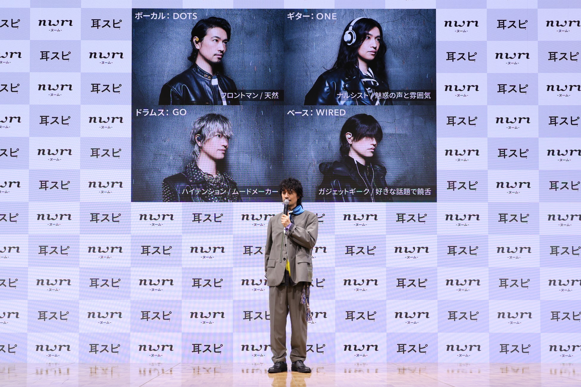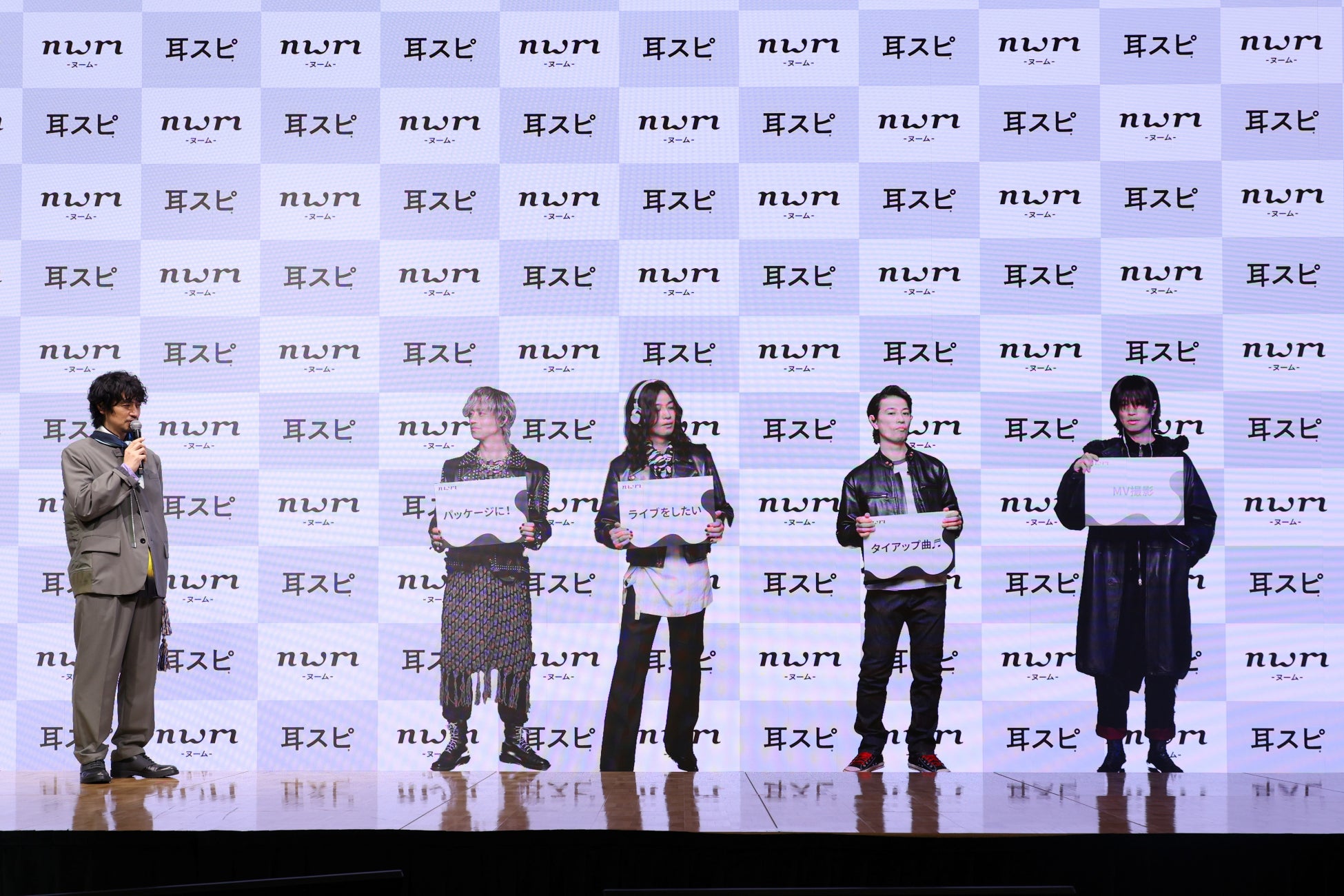 今回演じた4人のキャラクターについて説明した斎藤さんは、『4人と同時に会ったのは初めて』とコメント。その直後、「工~!nwmのアンバサダーおめでとう、MIMISPI!」という掛け声とともに、スペシャルゲストとしてH(E)ARD ROCK BAND「MIMISPI」の4人が登場。等身大のモニターに映し出された4人とご本人が共演する、まさに圧巻の演出となりました。