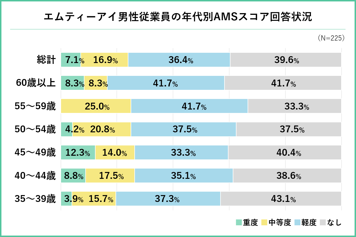 また、エムティーアイでは男性従業員の平均年齢が41.2歳であることから、一般的に45歳前後から発症しやすいとされる男性更年期障害にも注目し、35歳以上の男性従業員を対象に男性更年期症状に関するアンケート調査※6を実施しました。男性更年期障害のセルフチェックの際に用いられる質問票のひとつであるAMSスコアに回答してもらったところ、全体として重度~軽度の可能性がある人が60.4%にのぼりました。また、年齢別に見ると40~49歳の世代が重度の可能性がある人が多い結果となりました※。