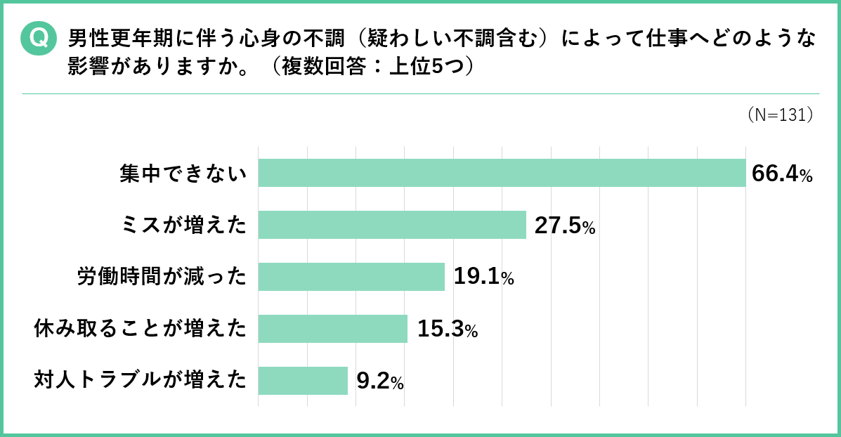 次に、男性更年期に伴う心身の不調(疑わしい不調含む)によって仕事へどのような影響があるかについては、「集中できない」66.4%、「ミスが増えた」27.5%、「労働時間が減った」19.1%が上位に挙がりました。「その他」(14.5%)の自由回答では「スピード感と限界値が下がった」「疲労感による仕事意欲の低下」という声が寄せられるなど業務に支障をきたしているようです。