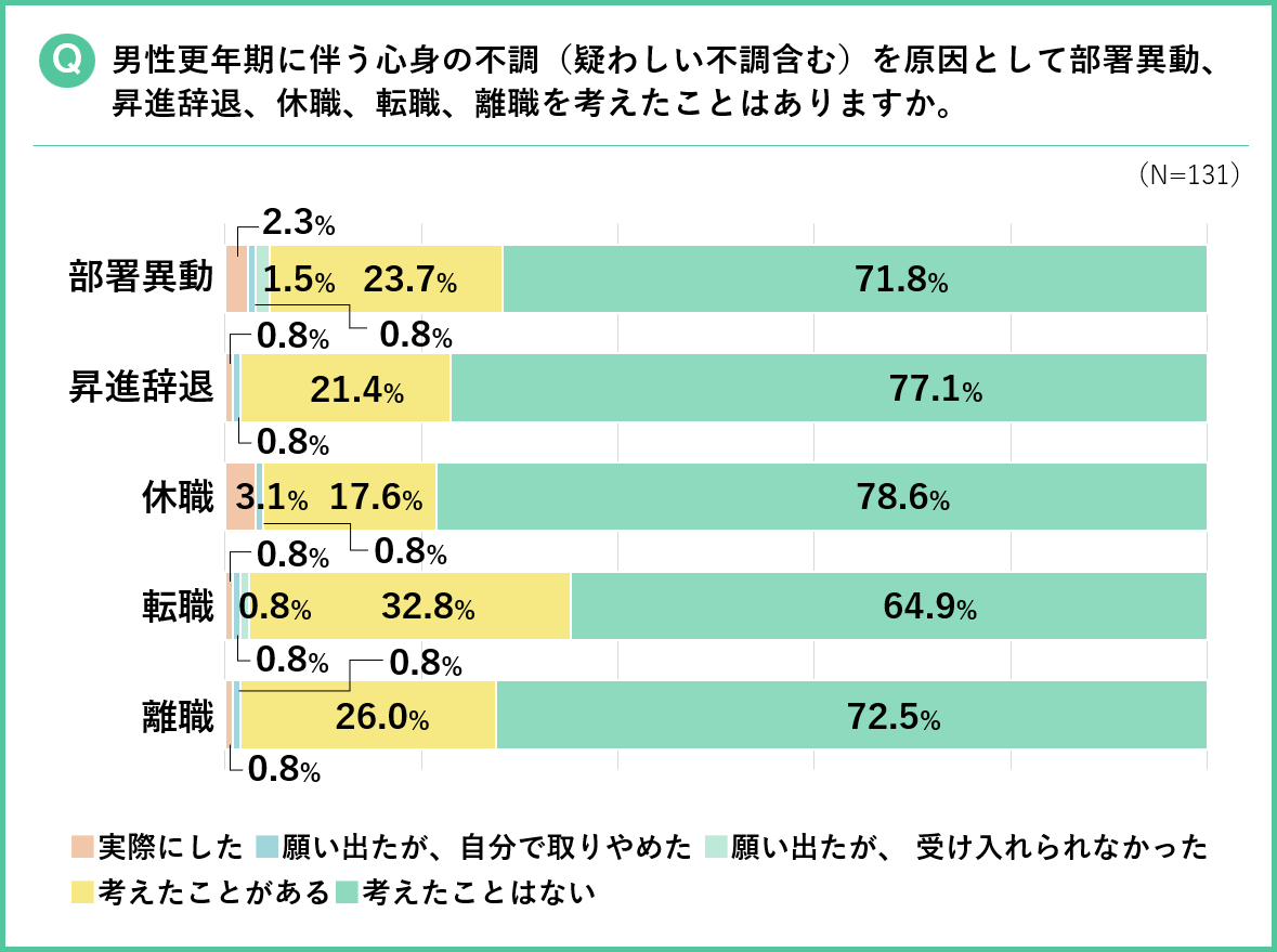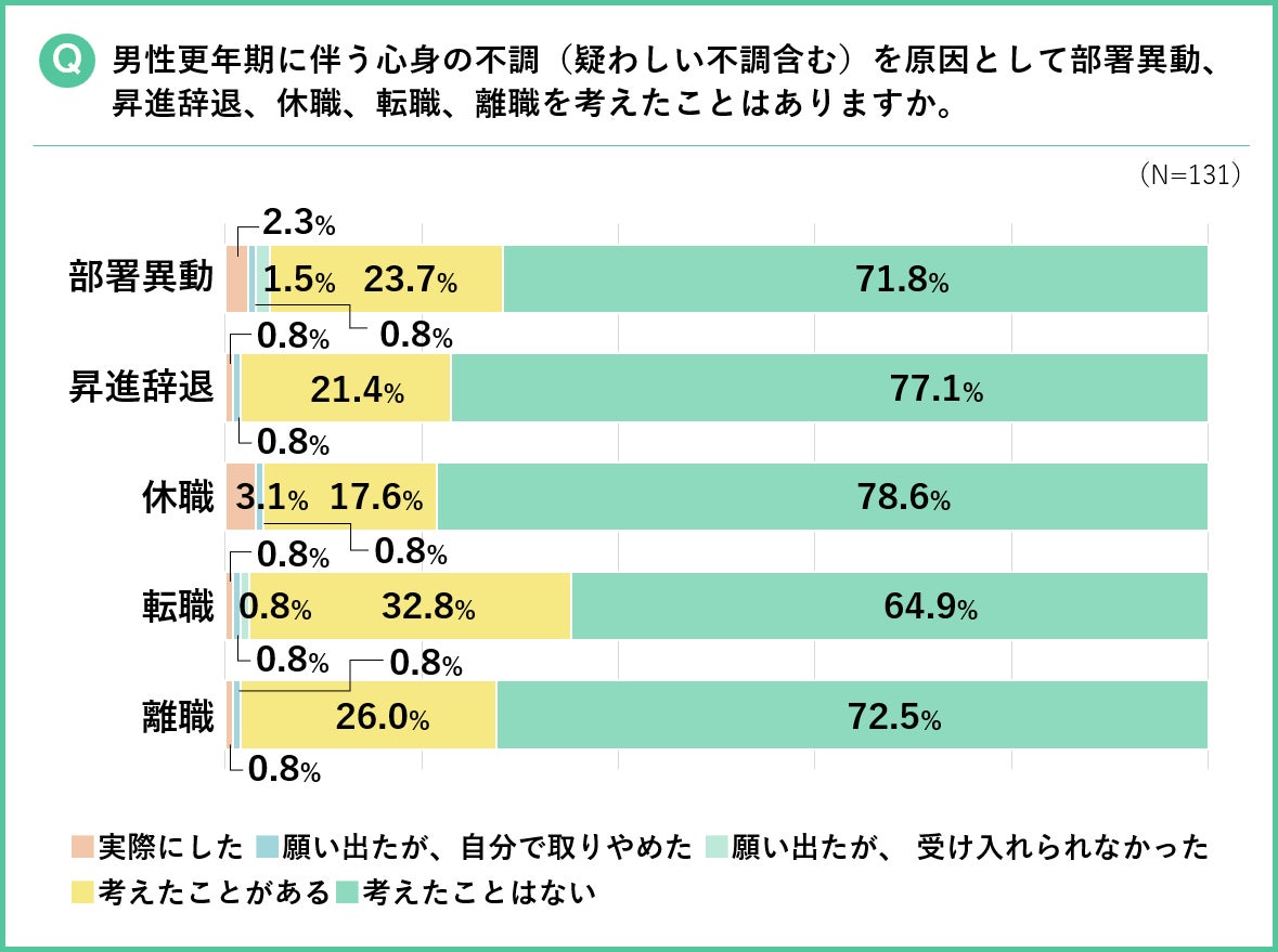 さらに、男性更年期に伴う心身の不調(疑わしい不調含む)によって部署異動、昇進辞退、休職、転職、離職を考えたことがあるかについて聞いたところ、実際に実行した人は1割以下でしたが、「考えたことがある」と回答した人は部署異動、昇進辞退、離職は2割以上、転職は3割以上となり、キャリアを考える上で障壁のひとつとなっていることがうかがえます。