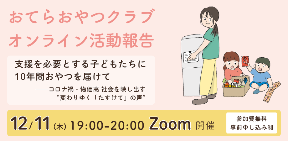 認定NPO法人おてらおやつクラブ(奈良県、代表理事:松島靖朗)は、2025年12月、子ども支援の現場での課題や支え合いの実践を伝える「歳末たすけあいイベント」(全3企画)を開催します。