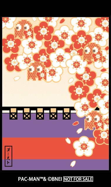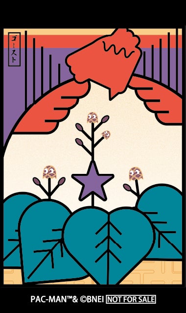 本作では、その光札にPAC-MANのモチーフを重ね合わせた。PAC-MANは光札一枚にしか存在せず、ゴーストたちは札を「ゴーストハウス」に見立てて閉じ込められている。伝統的な意匠とゲームのキャラクターが交差することで、新しい表現の広がりが生まれている。