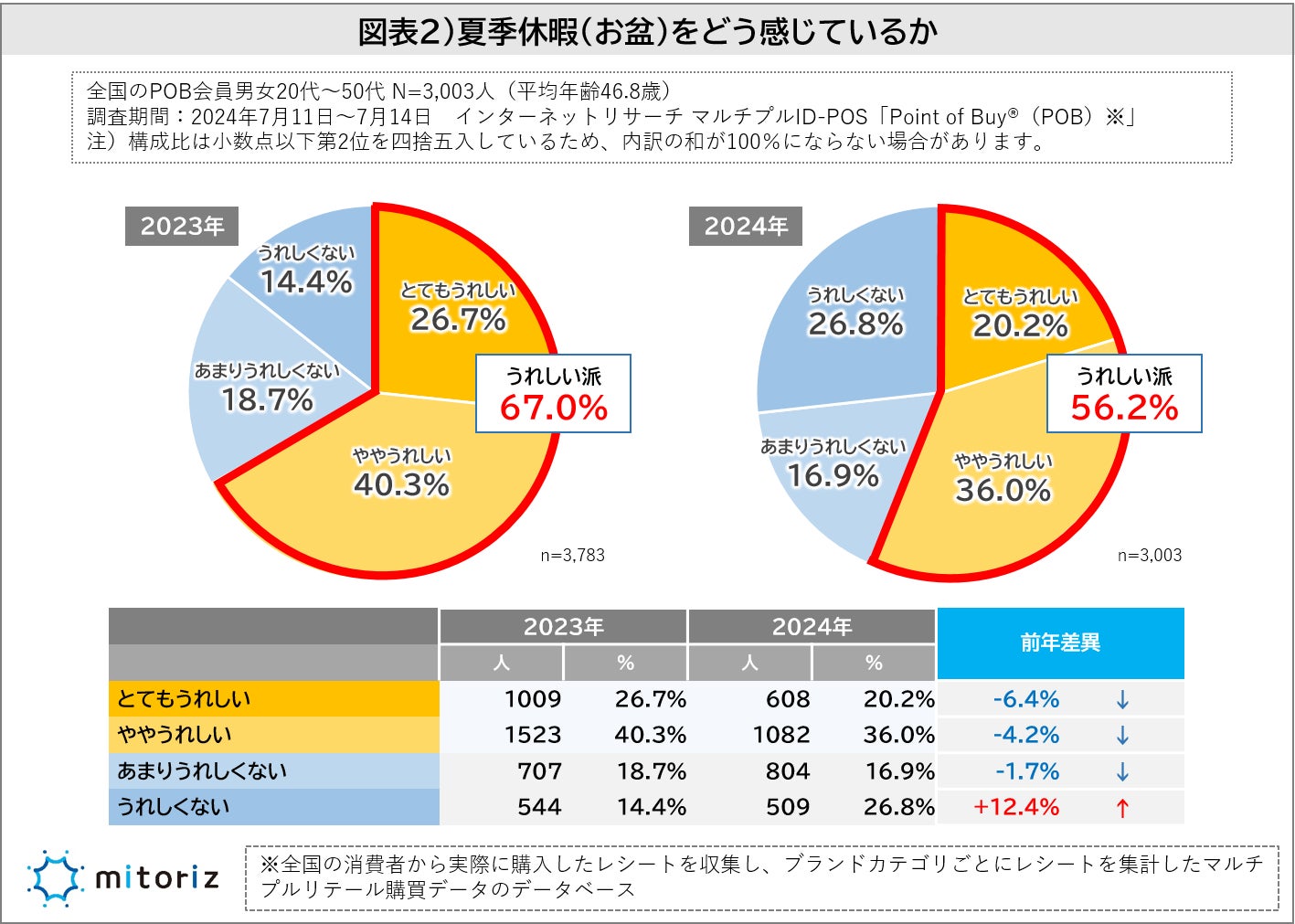 ・夏季休暇を“うれしい”と感じている人は56.2%で2023年の67.0%から10%のマイナス