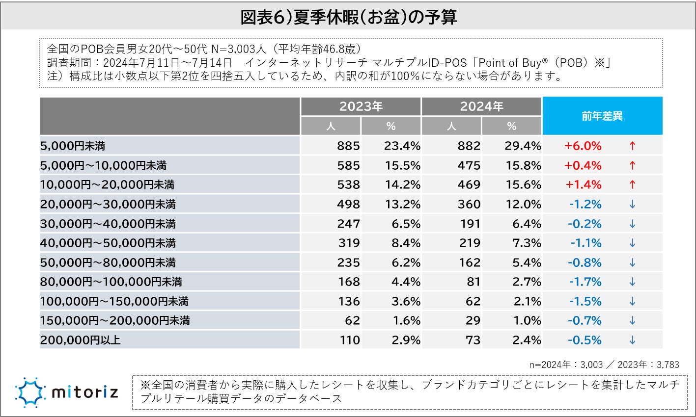 「夏季休暇(お盆)の予算」を調査したところ、最も多い回答は「5,000円未満(29.6%)」となり、2023年よりも6.0%増となりました。2023年と比較して20,000円未満が増加している一方で、20,000円以上は軒並み減少しており、物価高の影響もあってか、2024年の連休に向けた予算は縮小傾向にあるようです(図表6)。