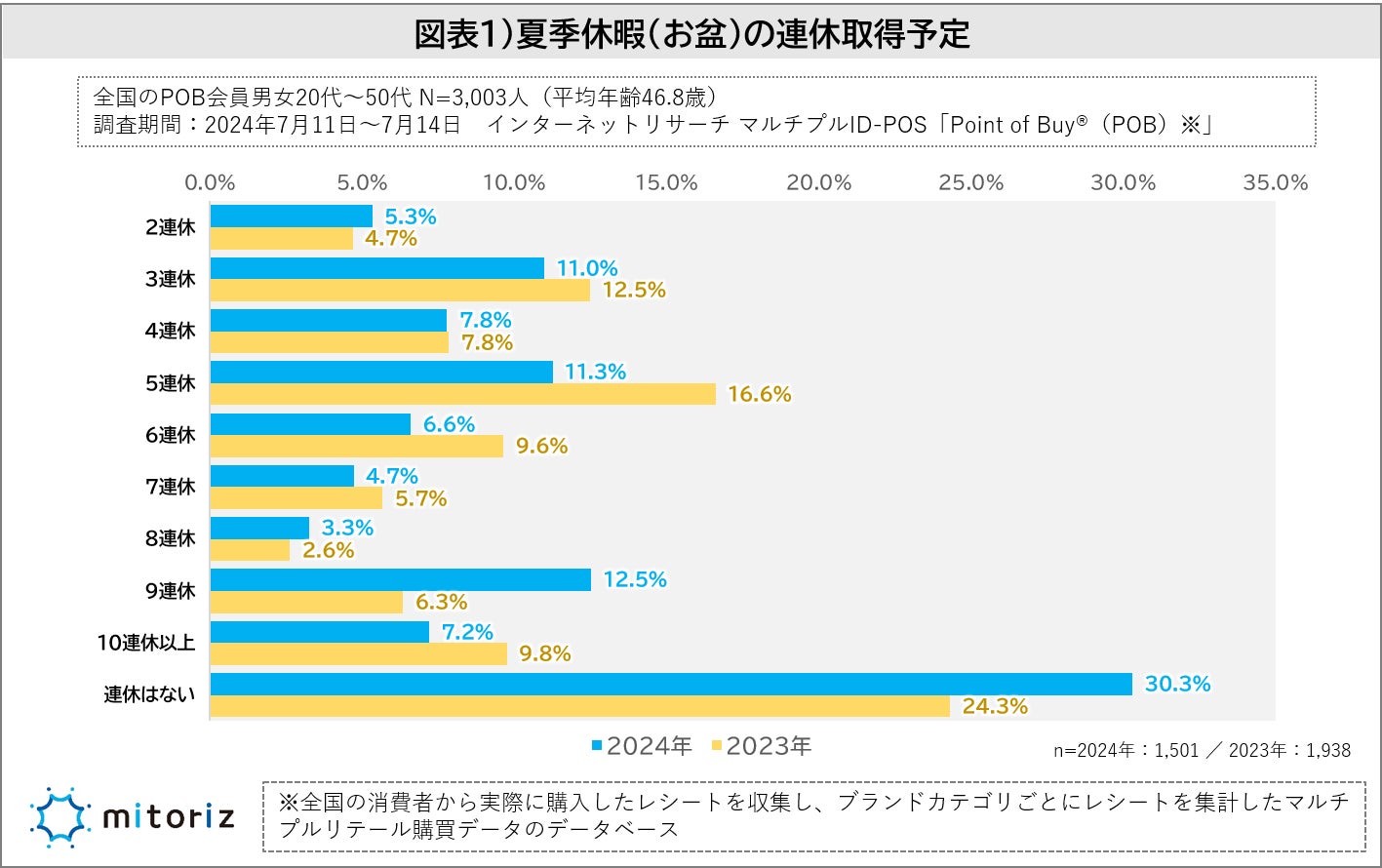 株式会社mitoriz(本社:東京都港区、代表取締役社長:木名瀬博)は、消費者購買行動データサービス「Point of Buy®(以下、POB)」の会員3,003人を対象に、2023年に引き続き「お盆休み・夏季休暇に関する調査」を実施致しました。
