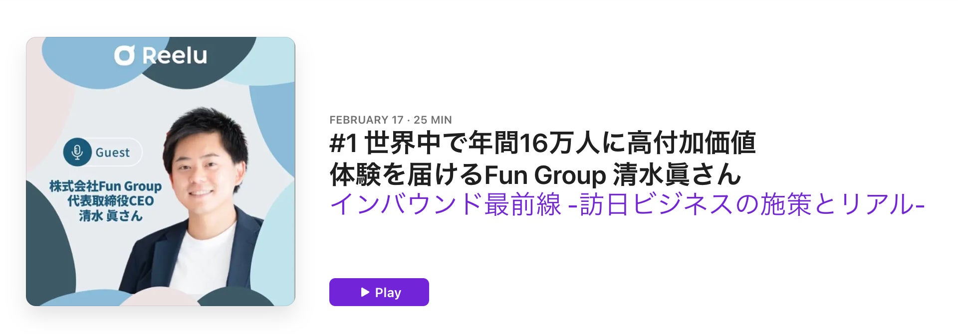 株式会社Reelu(本社:東京都港区、代表取締役CEO:今野珠優、以下 Reelu)は、音声番組 「インバウンド最前線 -訪日ビジネスの施策とリアル-」 の配信を開始したことをお知らせいたします。本番組では、訪日ビジネスに関わるゲストを迎え、各社・各現場の実践をもとに、施策の意図や実装の進め方、そこから得られた示唆を具体例とともにお届けします。