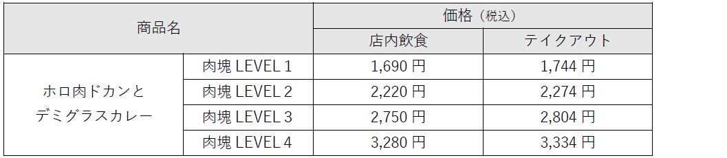 「ホロ肉ドカンとデミグラスカレー」は、ご注文時に肉塊レベルをお選びいただく「肉塊オーダー制」です。肉塊レベルは豚肩ロース肉の量を表しており、LEVEL1~4まで4段階のサイズをご用意しました。お好きなサイズをご注文いただき、心ゆくまで肉塊をお楽しみください。