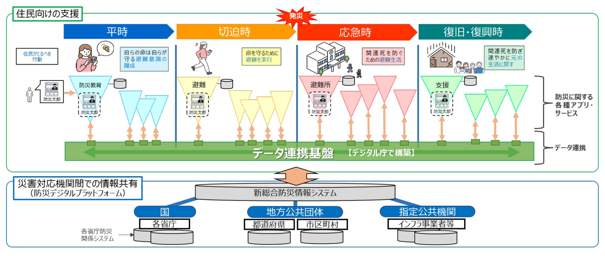 そこでデジタル庁は、平時、切迫時、応急時、復旧・復興時という災害のフェーズごとに求められるサービスとそれに必要なデータの抽出等を行い、様々な防災アプリ等の間でデータの連携が図られるようデータ連携基盤の設計・構築を進めることになりました。