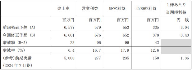 当社は、最近の業績の動向等を踏まえ、2025年3月14日に公表いたしました2025年7月期(2024年8月1日~2025年7月31日)の通期業績予想及び配当予想を下記のとおり修正いたしましたのでお知らせいたします。