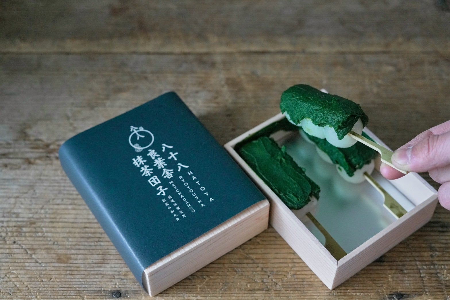 毎日丁寧にセイロで蒸し上げるもっちり食感の団子に、特製の濃厚抹茶餡をたっぷりと塗った八十八良葉舎の「抹茶団子」。