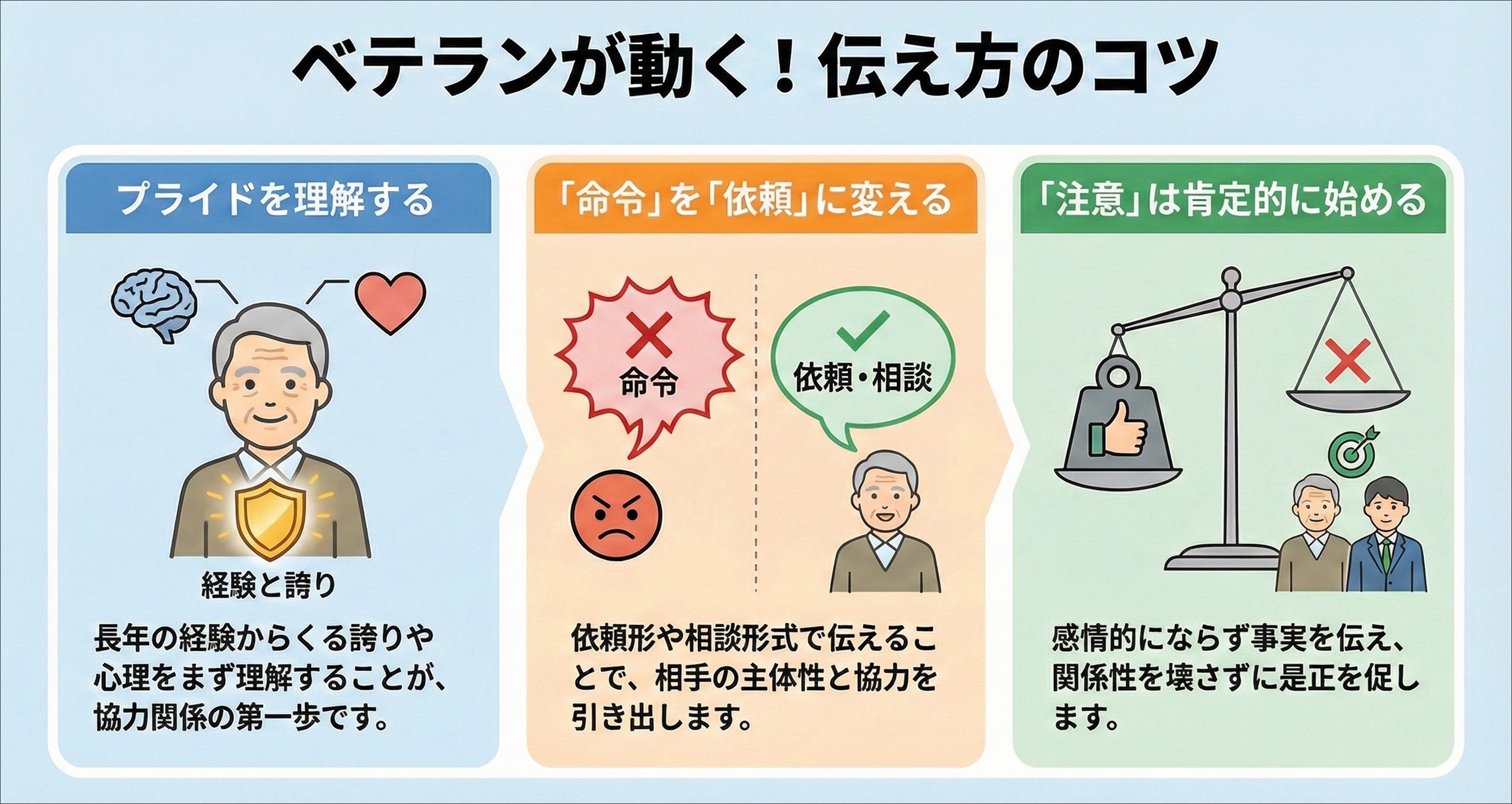 ベテランの心理を理解し、指示が拒否される背景を把握する。