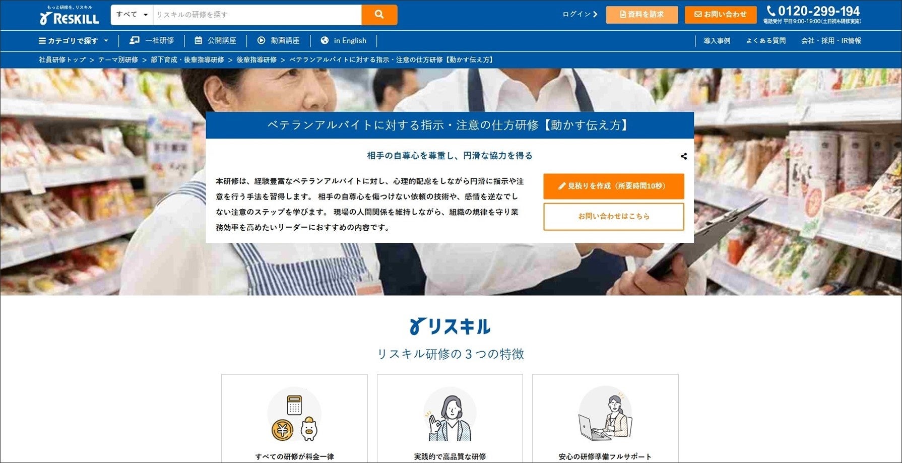 株式会社リスキルでは、今回リリースしたベテランアルバイトに対する指示・注意の仕方研修をはじめとした部下育成・後輩指導研修や、幅広いラインナップの研修を提供しています。