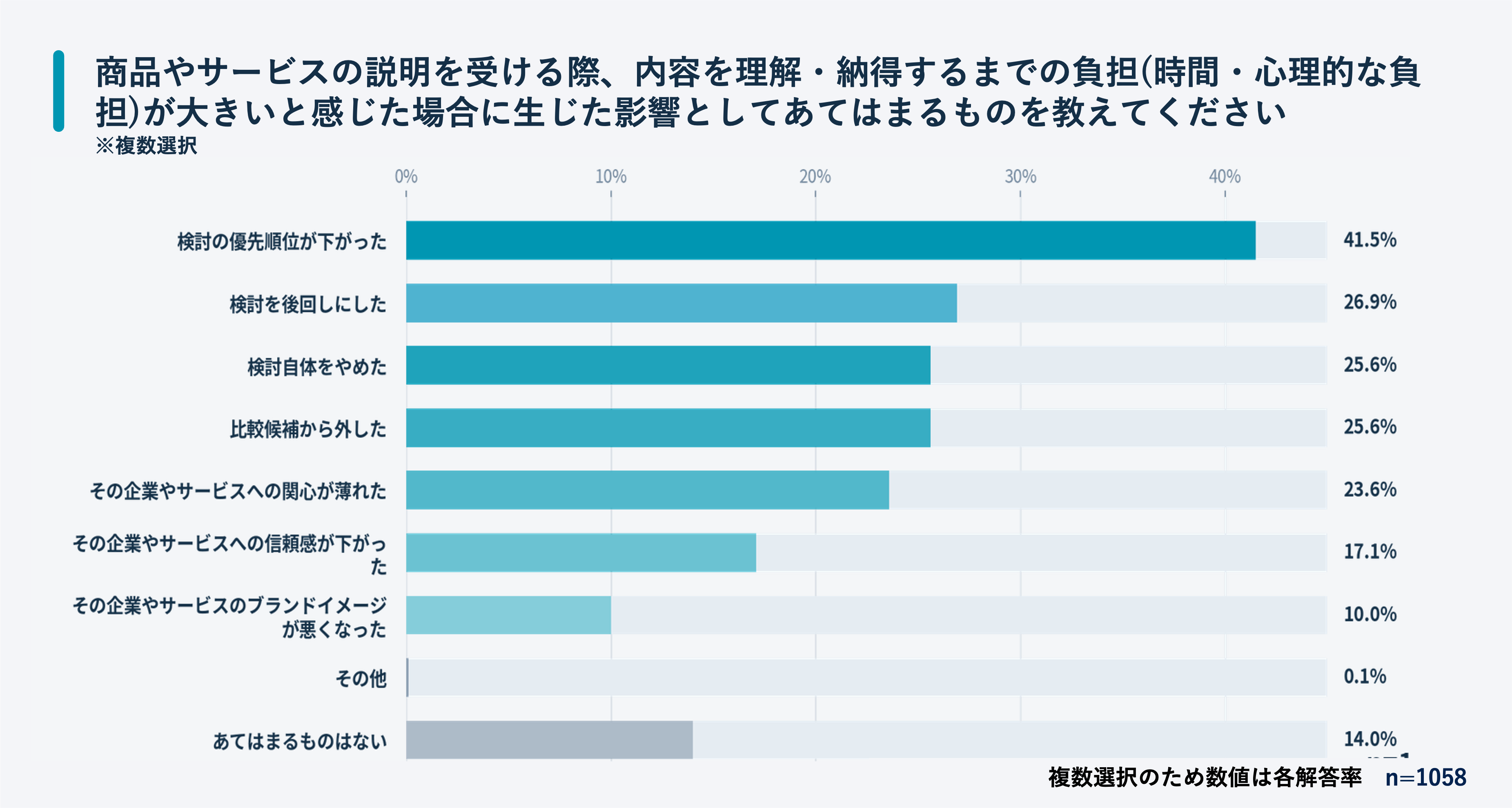 これらのコストは単なる不快感にとどまらず、41.5%が「検討の優先順位低下」、25.6%が「比較候補からの除外」を招いており、企業にとって無自覚かつ致命的な機会損失に直結しています。