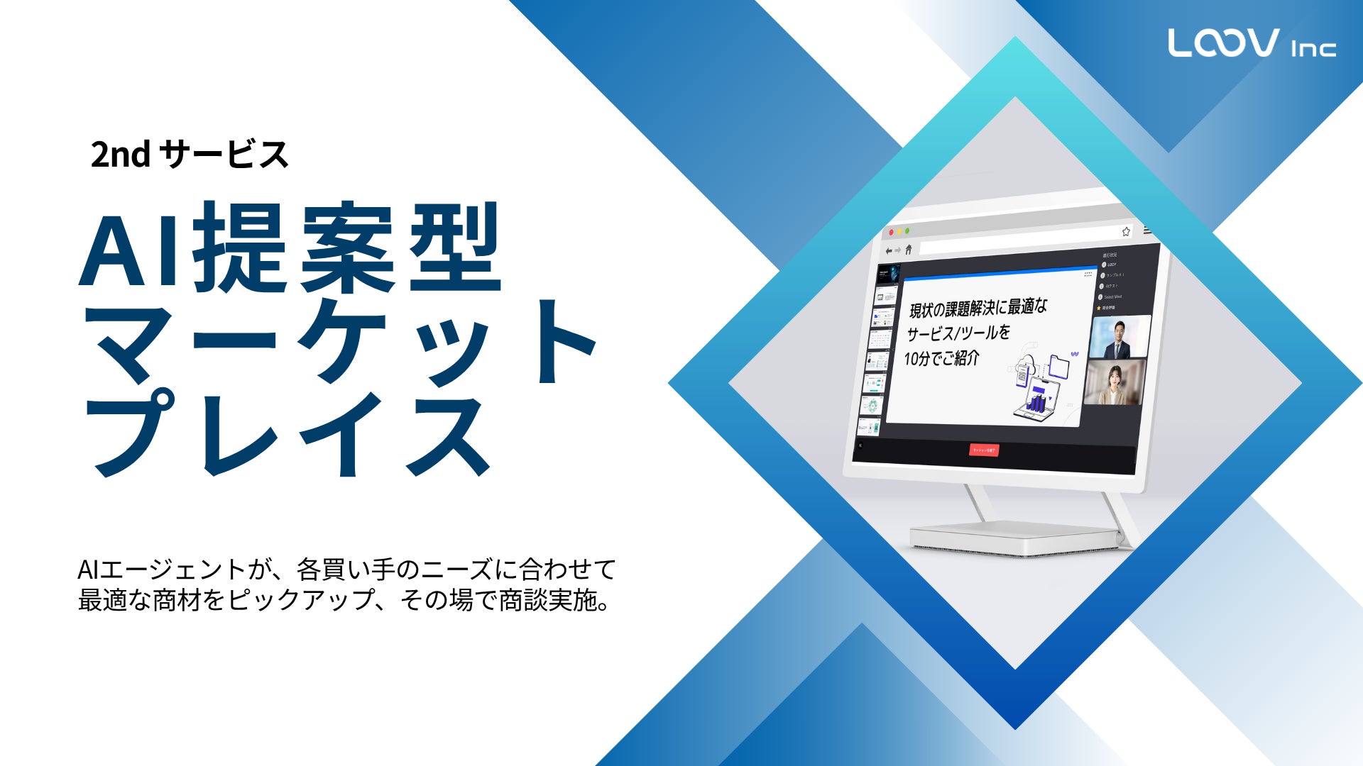 AIエージェントが24時間365日、自社の魅力を最大限に伝える「最適なプレゼンテーション」を自動で実行。確度の高い商談獲得を自動化し、営業リソースを真に人間が担うべき創造的な活動へシフトさせます。 LOOVは、この「最適なマッチングの自動化」を通じて、ビジネスの停滞(ノイズ)をゼロにし、意思決定の総量を最大化することで、社会全体の生産性向上と経済の活性化に貢献してまいります。