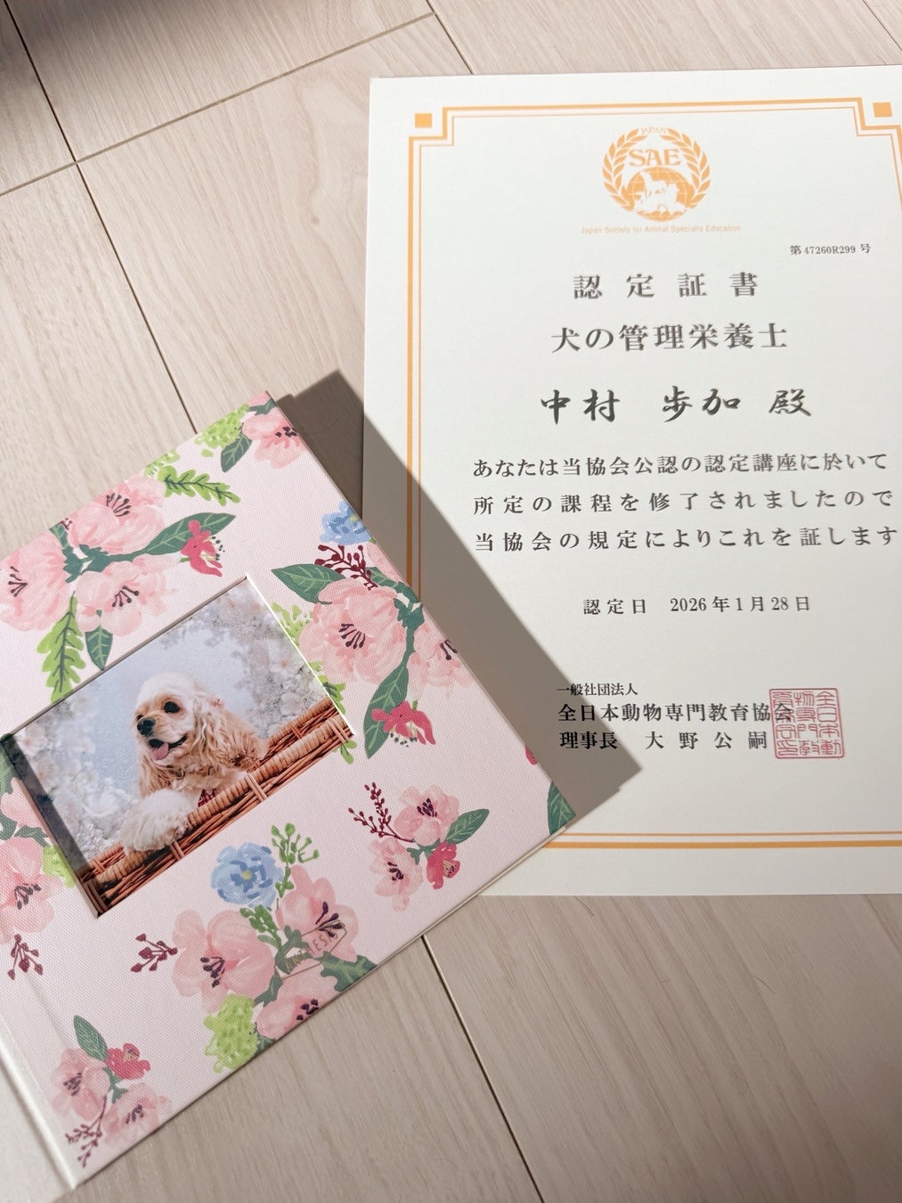 今回の資格取得は、単なる趣味の延長ではなく、「正しい知識を持って愛犬に向き合いたい」という想いから挑戦したものです。犬の健康や食事管理に関する専門的な知識を体系的に学び、理解を深めた上での資格取得となりました。