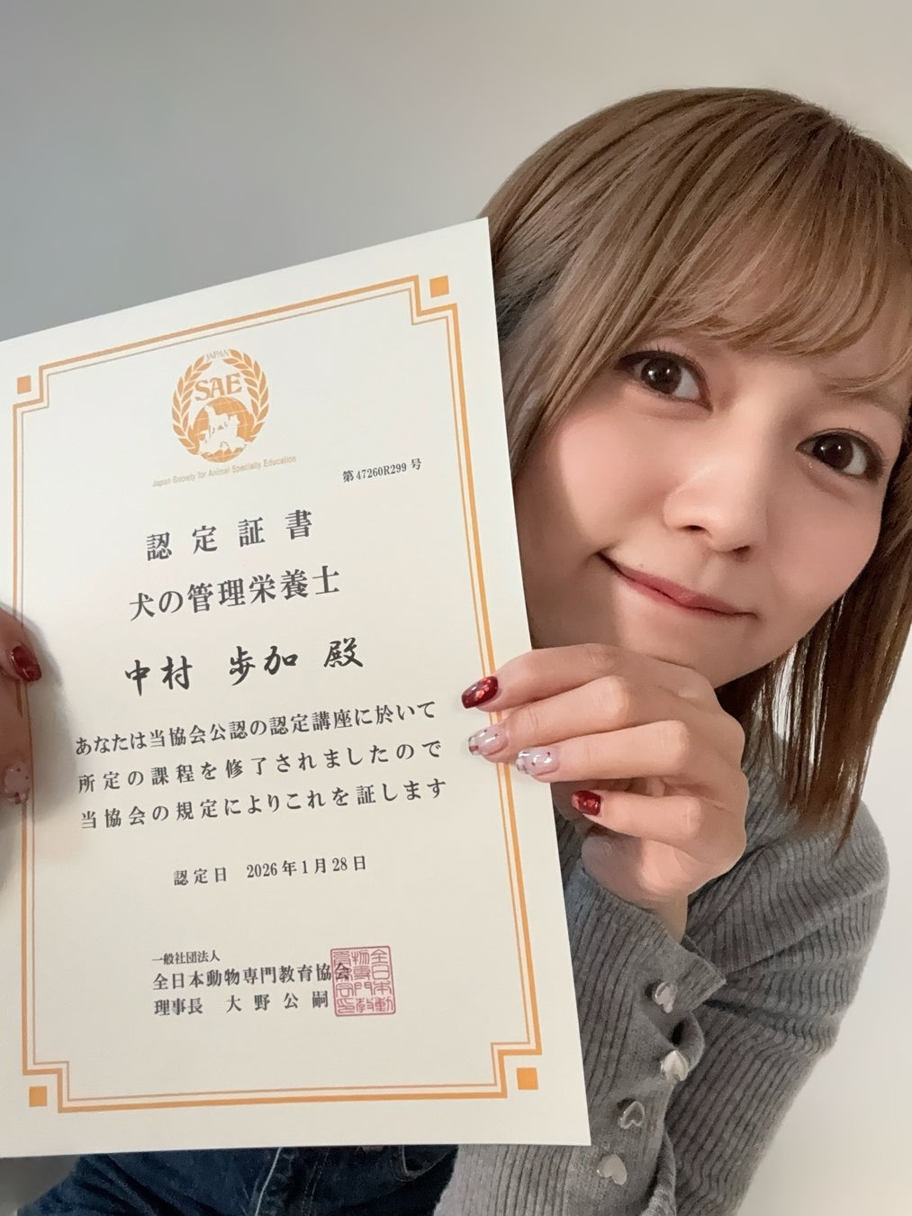 中村歩加が、犬の管理栄養士資格を取得しました。