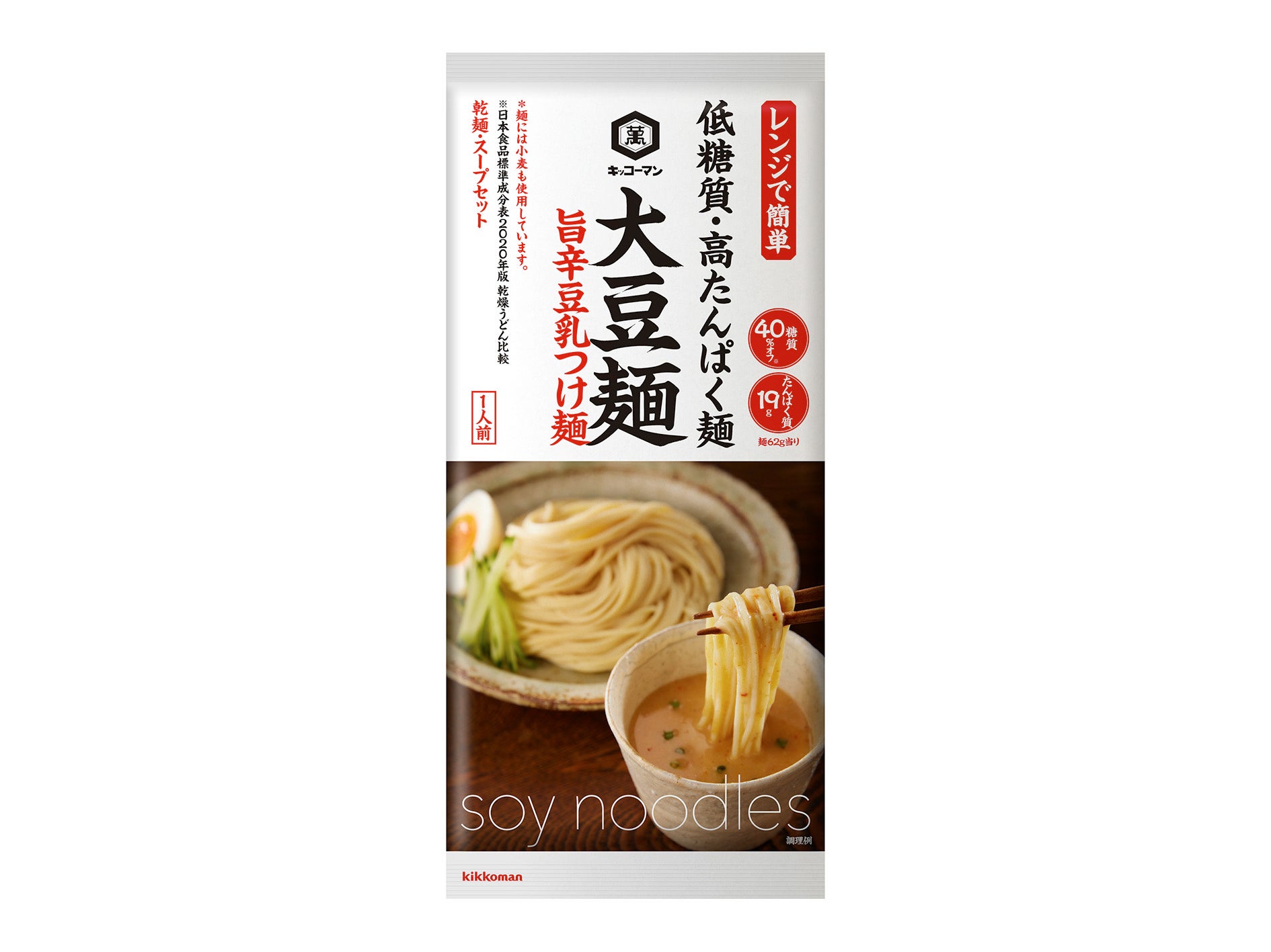 ■「キッコーマン 大豆麺」シリーズ(2022年8月発売) ・大豆を使った麺(乾麺)と専用のスープやソースをセットにした“新しい主食”です。 ・1袋1人前入りです。 ■麺の特徴 ① 大豆を50%配合しており、のどごしなめらかな麺です。 (麺には小麦も使用しています。) ② 低糖質・高たんぱくな麺です。 -糖質は、乾燥うどんと比較し、40%カット(*1)しています。 -たんぱく質を麺1食(62g)当たり、19g含みます(*2)。 乾燥うどんの約3倍で、鶏むね肉(1食分・100g)とほぼ同等です。 ③ 麺は電子レンジで簡単に調理できます。小鍋やフライパンでゆでて調理することもできます。 (*1)日本食品標準成分表2020年版「干しうどん 乾」との比較です。 (*2)日本食品標準成分表2020年版「にわとり むね 皮つき」100gのたんぱく質は19.5g、「干しうどん 乾」62gのたんぱく質は5.3gです。 |