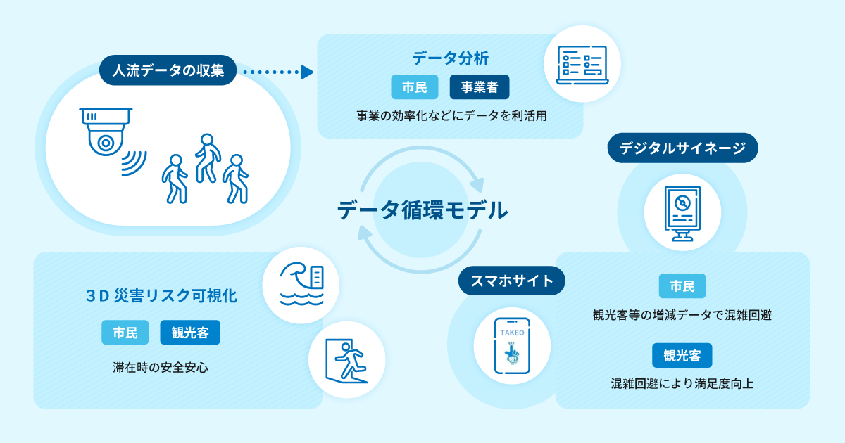 武雄市では、2022年9月に西九州新幹線が開通してから国内外の観光客が増加し、コロナ禍以降の宿泊施設や観光スポットなどの状況も変化していることから、人気観光スポットの混雑や渋滞が懸念されていました。そこで武雄市は人流データ基盤を開発し、人流データを把握して混雑状況などを可視化するとともに、デジタルサイネージ等で観光案内コンテンツを提供することで、観光客の回遊性を高められるかを検証することとなりました。また、人流データ基盤は観光地の混雑対策だけではなく、観光客などの人流の増減を考慮した災害シミュレーション等にも活用でき、今後は交通など、地域の課題解決への活用も可能となります。