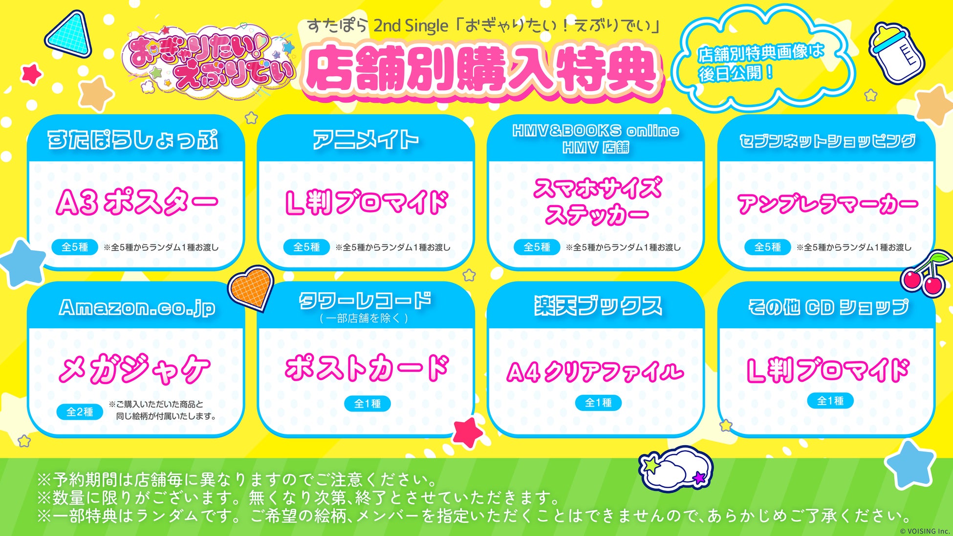 さらに、今回のシングルリリースを記念して、すたぽら初となる全国オフラインイベントの開催が決定。対象店舗にて『おぎゃりたい!えぶりでい』を購入された方の中から抽選で当選された方をオフラインイベントへご招待いたします。本イベントは、店舗ごとに異なる形式で実施され、ファンの皆さまにとって特別な体験となる内容を予定しております。アニメイトでは、ご希望のメンバーとの個別握手会を、HMVでは、ご希望のメンバーからイベント限定のノベルティを手渡しで受け取れる、個別お渡し会を、タワーレコードでは、すたぽらメンバー5名との全員ハイタッチ会を実施いたします。