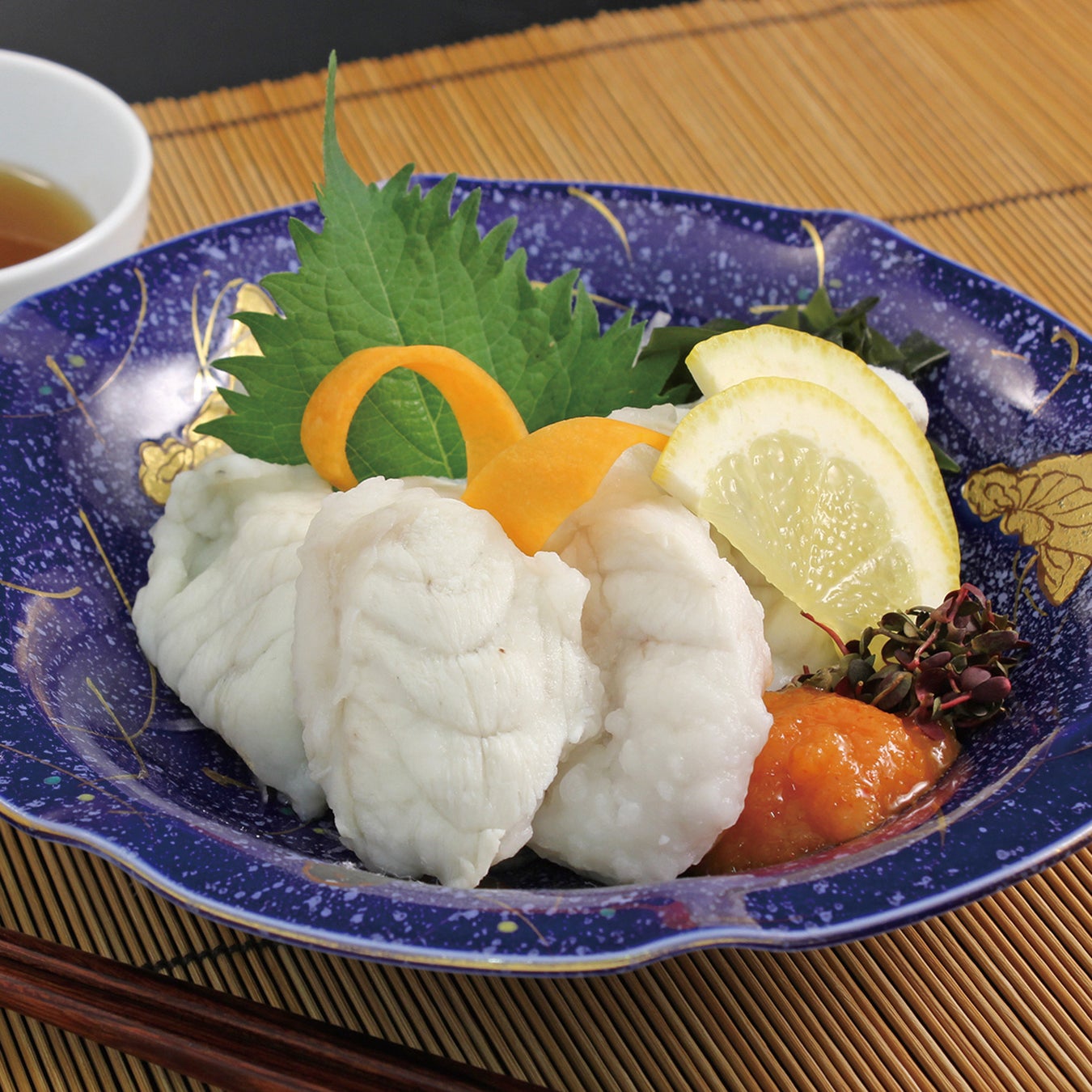 国産のマフグにでん粉をまぶして湯引きに仕上げた、上品な味わいの一品です。解凍するだけで使える簡便商品で、ポン酢やもみじおろしを添えてそのままお召し上がりいただけるほか、サラダやカルパッチョ、お吸い物やお茶漬けの具材としても幅広くご活用いただけます。秋から冬にかけての季節メニューとしておすすめの一品です。