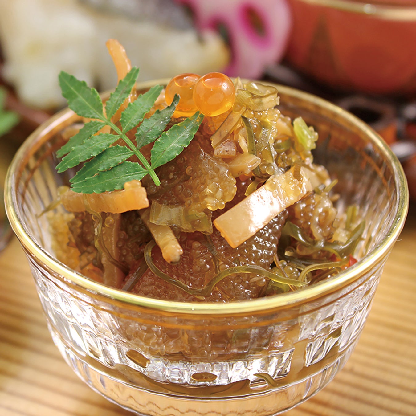 冷蔵で4日間じっくり熟成させることで、まろやかな風味に仕上げた松前漬です。北海道産の山わさびを加えることで、ピリッとした辛みと爽やかな風味が絶妙に調和し、味わいに深みをプラス。さらに、数の子をふんだんに使用し、コリコリとした心地よい食感も楽しめる、季節を問わずおすすめできる逸品です。