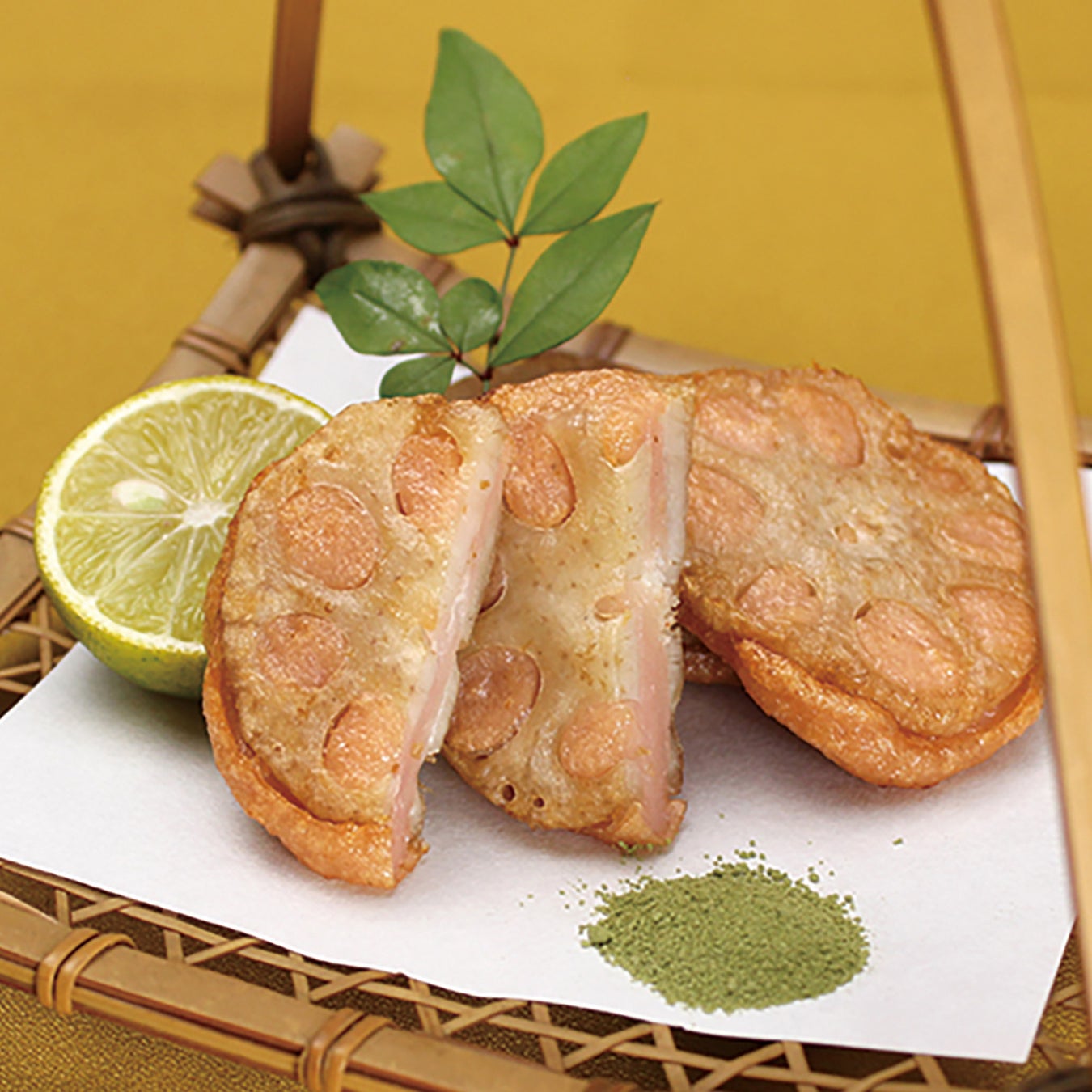 海老入りのすり身を蓮根で丁寧に挟み、揚げることで外は香ばしく、中はふんわりとした食感が楽しめる一品に仕上げました。自然解凍でそのままご使用いただけるため、会席料理や居酒屋の前菜・八寸、揚物、お弁当の具材としても便利です。加熱後に甘酢あんや黒酢あんをかけ、薬味を添えることで、さらにメニューの幅が広がります。手間なく華やかさを演出できる、汎用性の高い商品です。