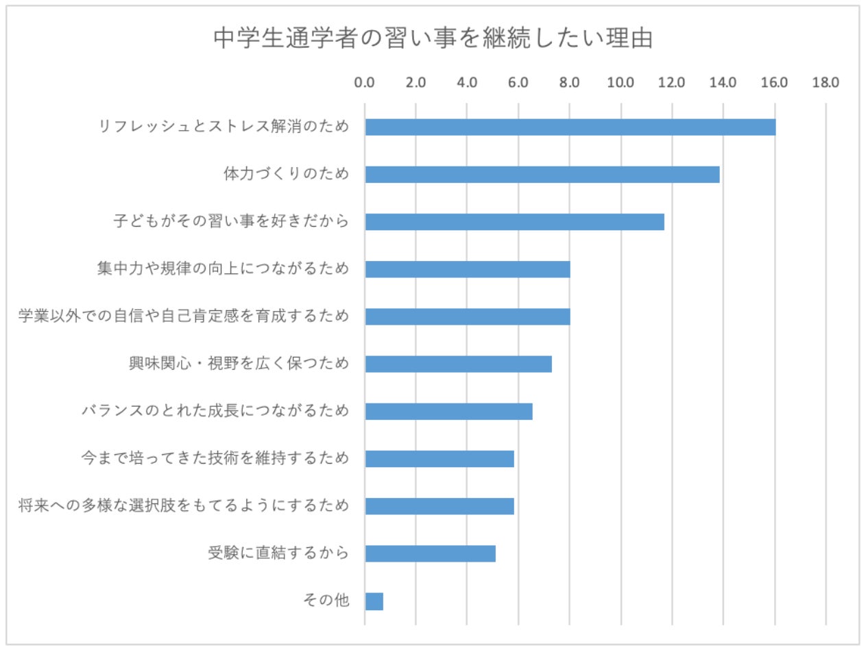 中学生が習い事を続けたい理由として「リフレッシュとストレス解消のため」が最も多く挙げ