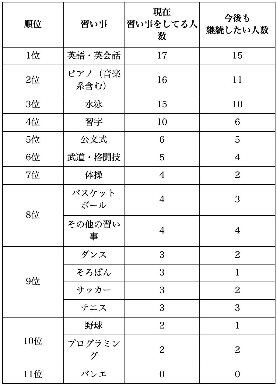 たい習い事として重視されていることが分かります。また、「ピアノ(音楽系含む)」や「水
