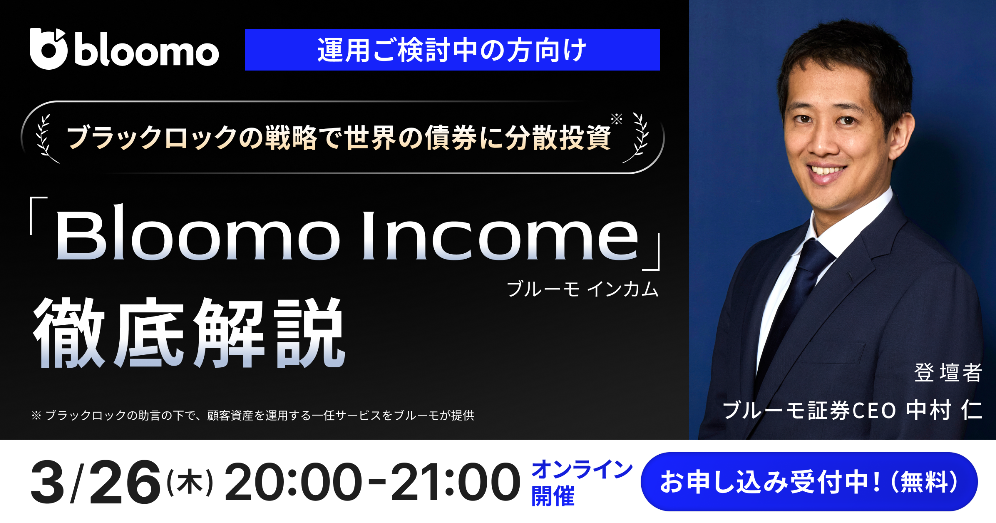 ブルーモ証券では『ブルーモインカム』での運用をご検討中の方向けに、3/26(木) 20:00〜21:00 に、サービス内容をより深くご理解いただくためのオンラインセミナーを実施いたします。