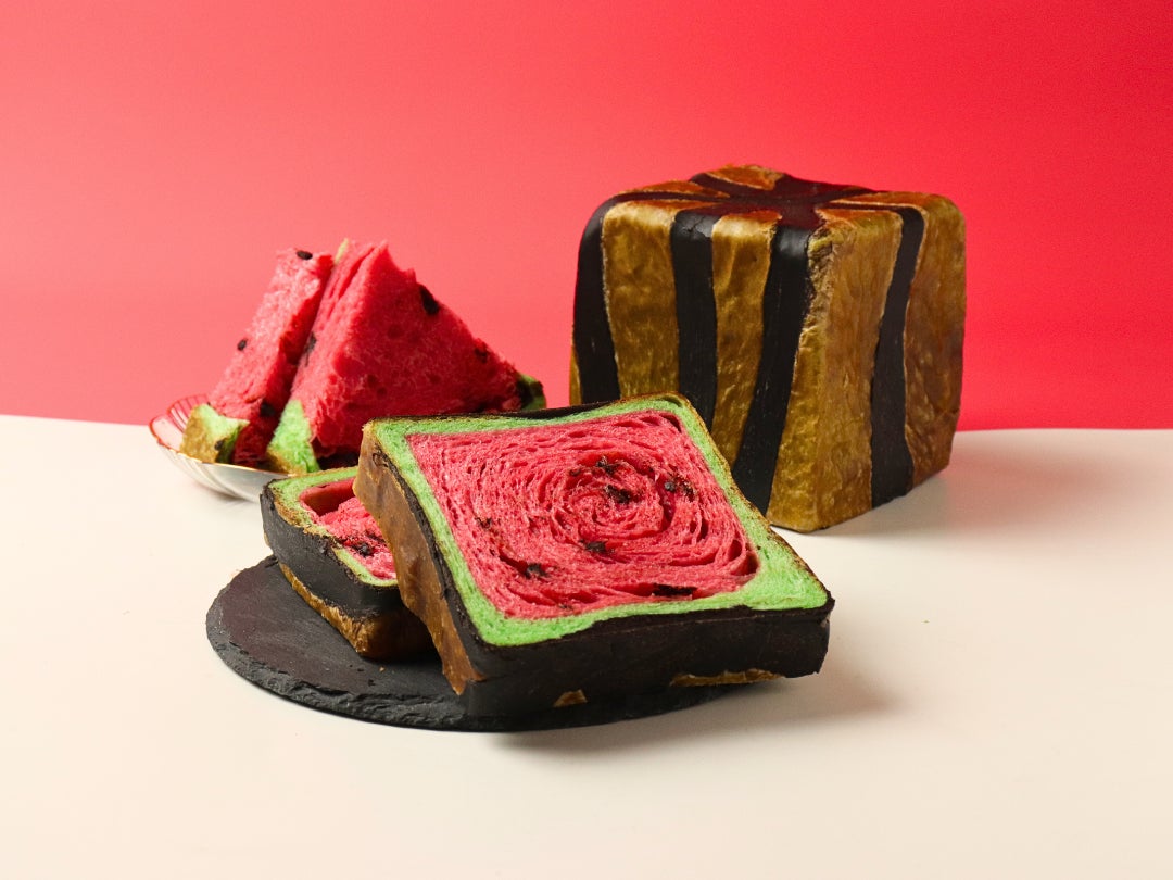ほんのり甘い「いちご風味」の生地に、種に見立てたチョコチップをたっぷり散りばめ、外側にはリアルなスイカの縞模様を再現。カットすれば、まるでスイカをそのままスライスしたかのような見た目に驚くはず。