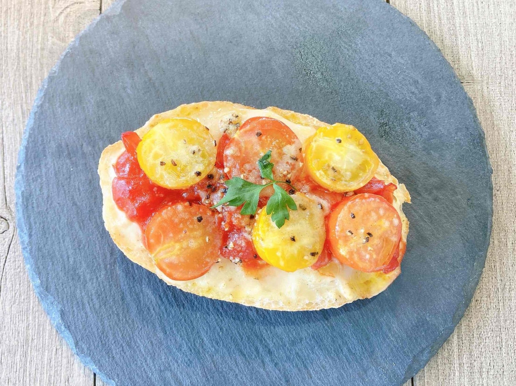 みずみずしいミニトマトとホワイトソースを、もっちりとしたパン生地に贅沢にトッピングです。