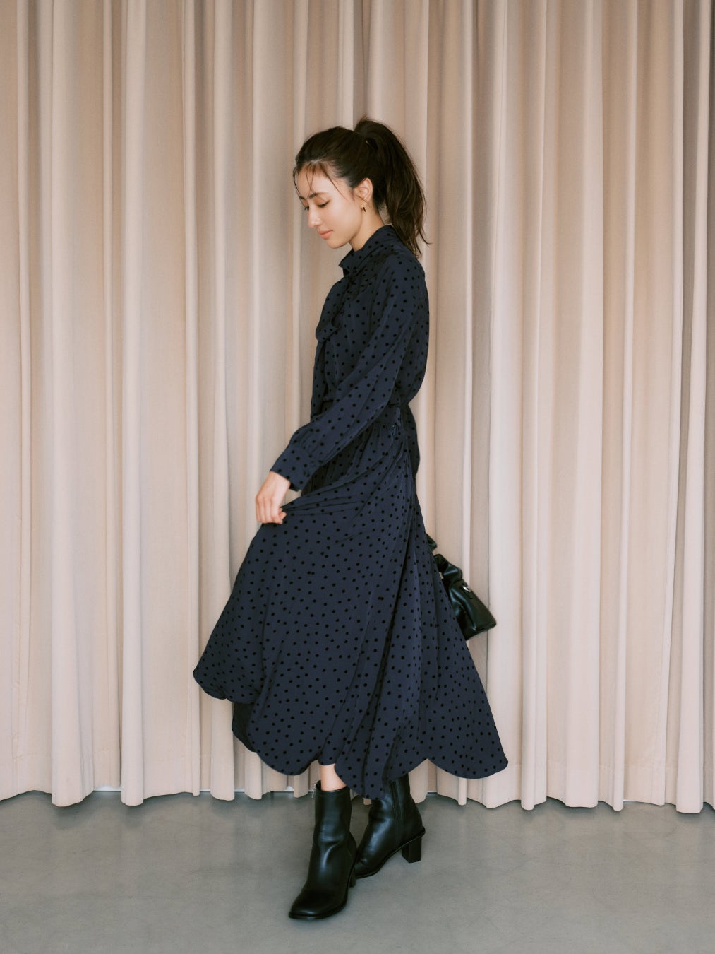 長めのボウタイや花びらのようなラウンドヘムなど、ドラマティックな要素をふんだんに詰め込んだブラウス&スカート。落ち感のあるネイビー地に立体的なドットのフロッキープリントを施し、大人っぽい印象に。