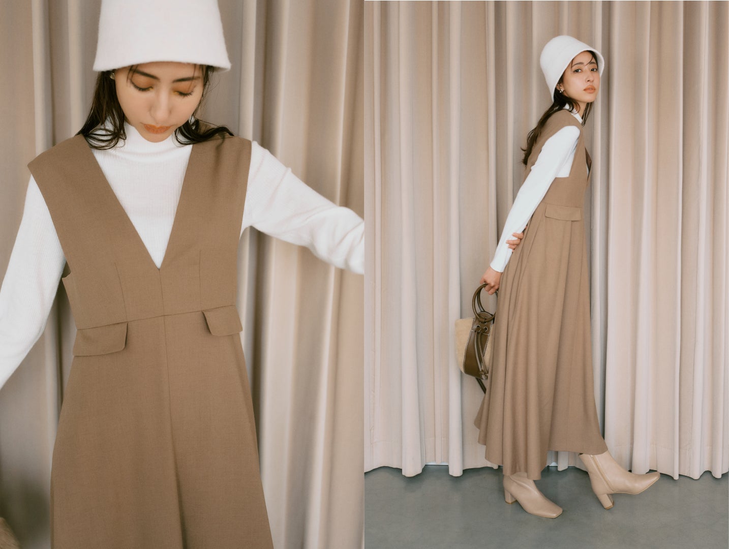 トレンドのジャンパードレスを淡色ツートーンで上品に。深いVネックとたっぷりのドレープで、現代的にアレンジしたウールジャンパードレス。白ニットと合わせて、あたたかなカフェラテ配色に。