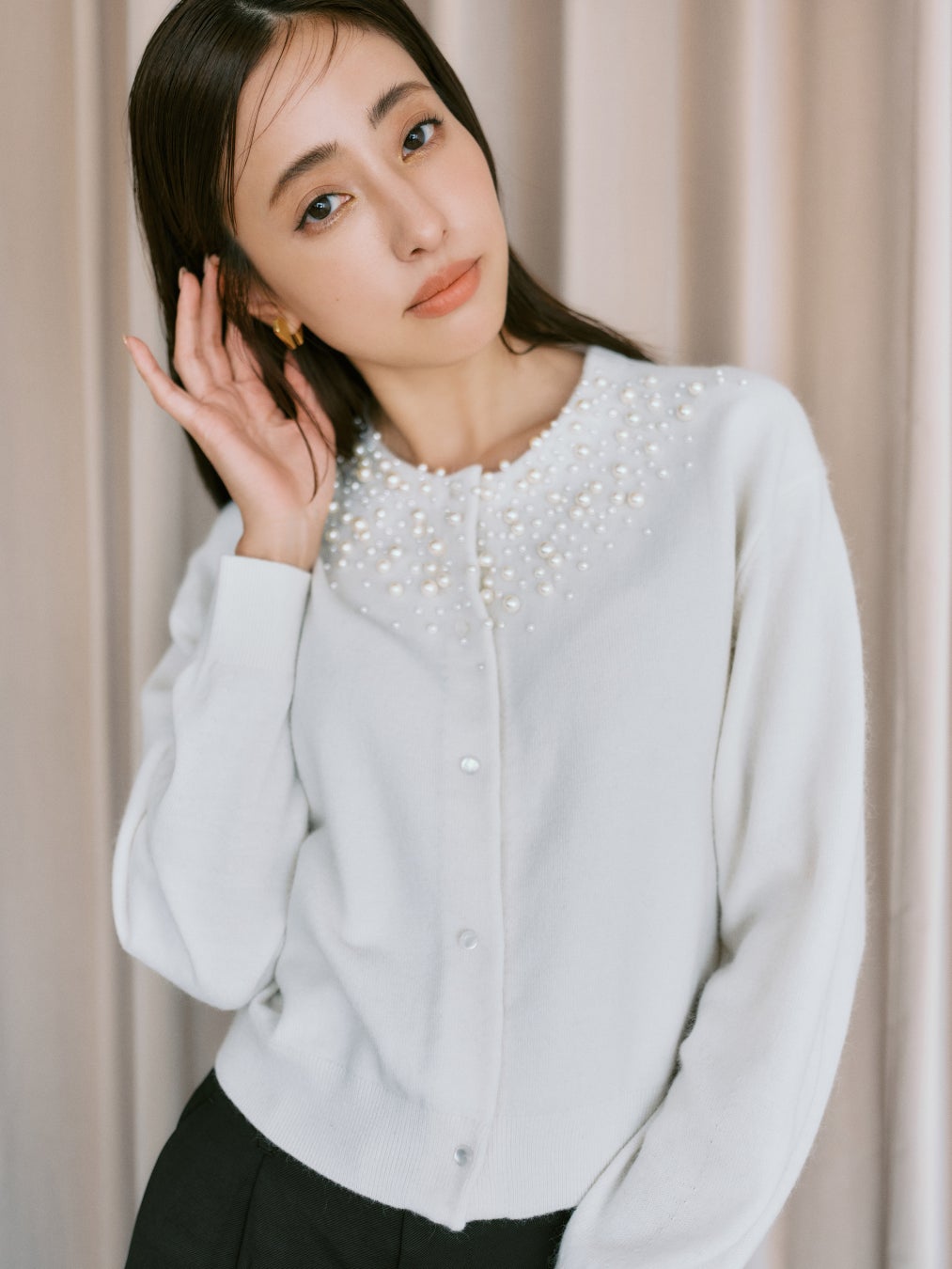 ふわふわニットにパール、上半身映えする冬の白。毛足感のあるアンゴラ混ニットの胸元に大小のパールを散りばめて。