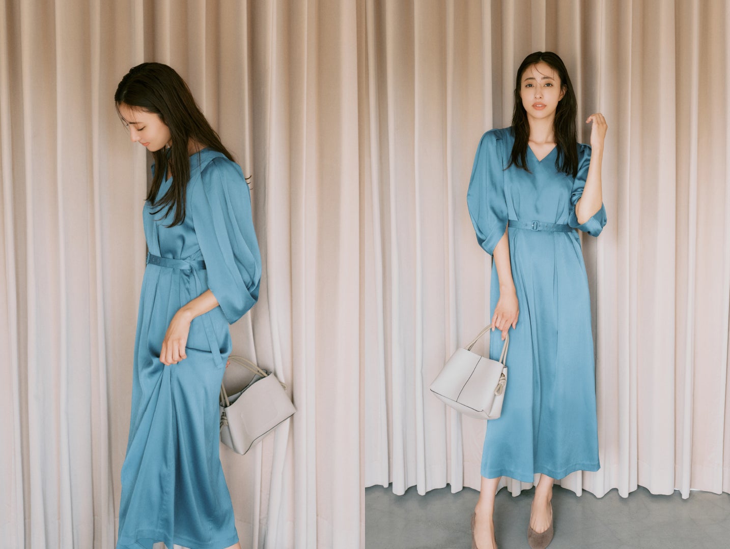 瞬時に華やぐサテンドレスはシックなブルーグリーンが新鮮。ブルーグリーンの落ち着いた色味と表情のある楊柳サテンで、派手見えしない加減を計算して。肘までまるく包むひとくせスリーブがアクセントに。